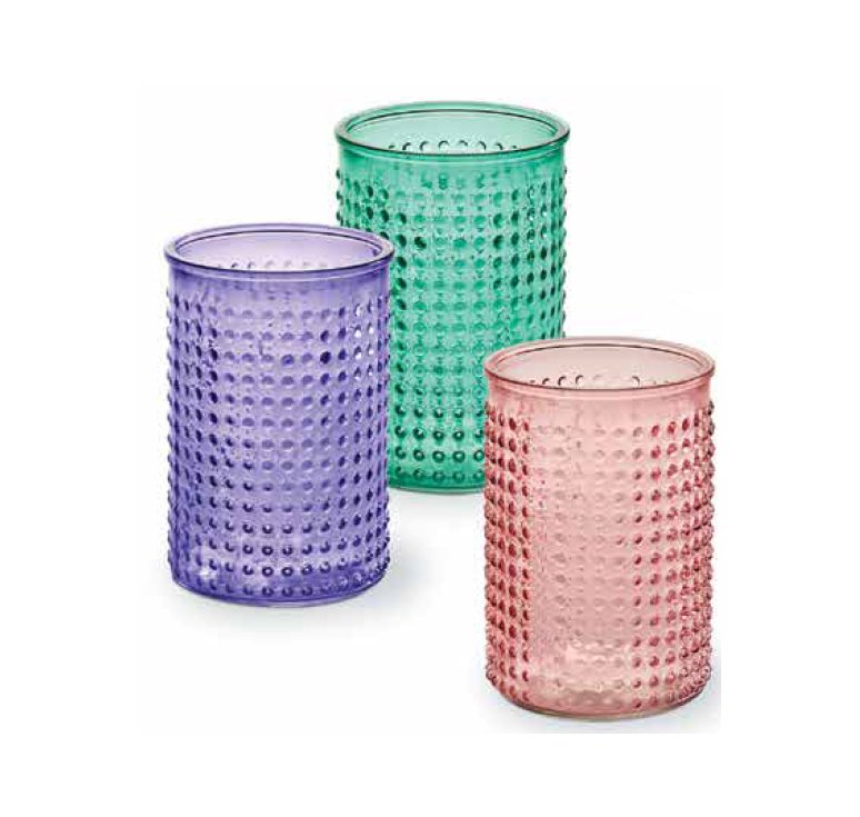 Cylinder Glass Vase with Textured ‘Dot’ Pattern; 3 Assorted Colors; 4″ opening x 6.75″ tall. **Please read the information below!**